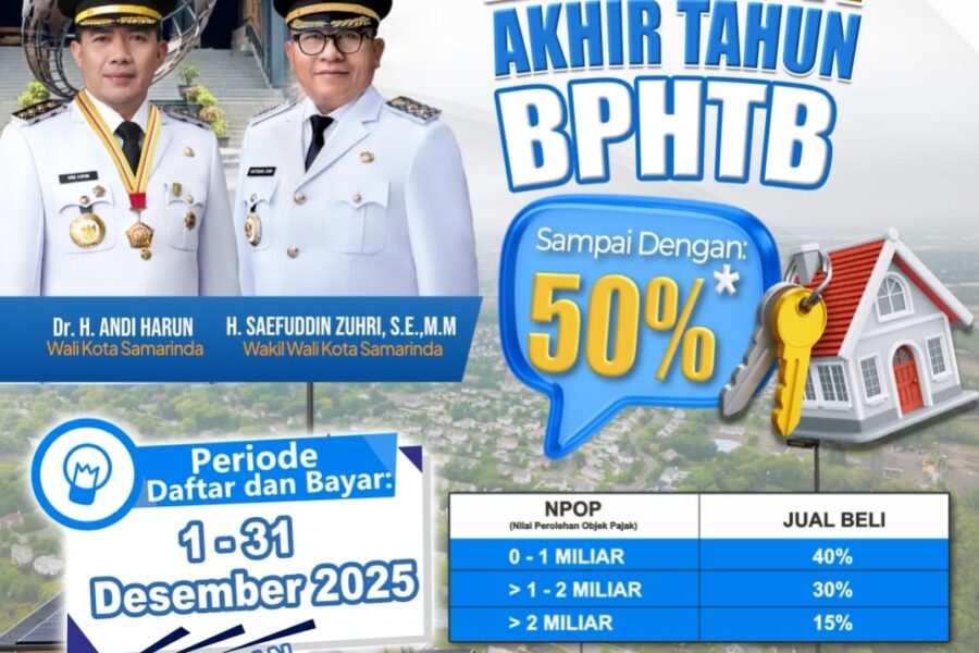 ADAKAH.ID, SAMARINDA — Pemerintah Kota Samarinda melalui Badan Pendapatan Daerah (Bapenda) resmi menggelar program Diskon Akhir Tahun Bea Perolehan Hak atas Tanah dan Bangunan (BPHTB) dengan potongan hingga 50 persen. Program ini berlangsung mulai 1–31 Desember 2025 dan menjadi kesempatan bagi masyarakat untuk menyelesaikan kewajiban BPHTB dengan biaya lebih ringan.