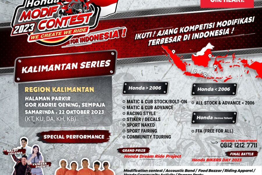 Hadir dengan tema “We Create We Ride For Indonesia!”, kompetisi ini mengajak seluruh modifikator berbakat area Kalimantan untuk dapat ikut serta dalam kompetisi yang akan digelar secara offline di GOR Kadrie Oening, Sempaja Samarinda.