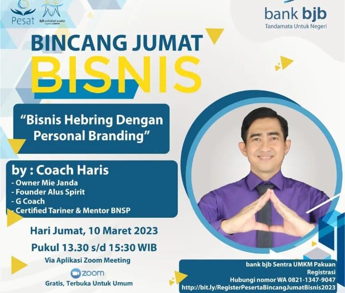 Semua itu akan dibahas dan dijawab bersama dalam Bincang Jumat Bisnis edisi 10 Maret 2023 dengan mengangkat tema ‘Bisnis Hebring dengan Personal Branding’ yang menghadirkan narasumber Coach Haris, owner Mie Janda yang juga Founder Alus Spirit, pun dikenal sebagai G Coach, founder Sobat Spirit, Certified Trainer & Mentor BNSP, Certified Life Coach by IALC dan Best Five Jawara UMKM bjb 2017.